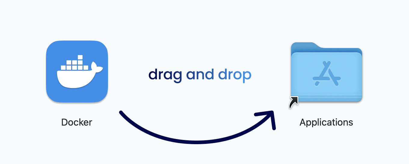 - 다운로드가 완료되면 .dmg 파일을 엽니다. 창이 나타나면 Docker 아이콘을 Applications 폴더 아이콘으로 끌어다 놓으세요.