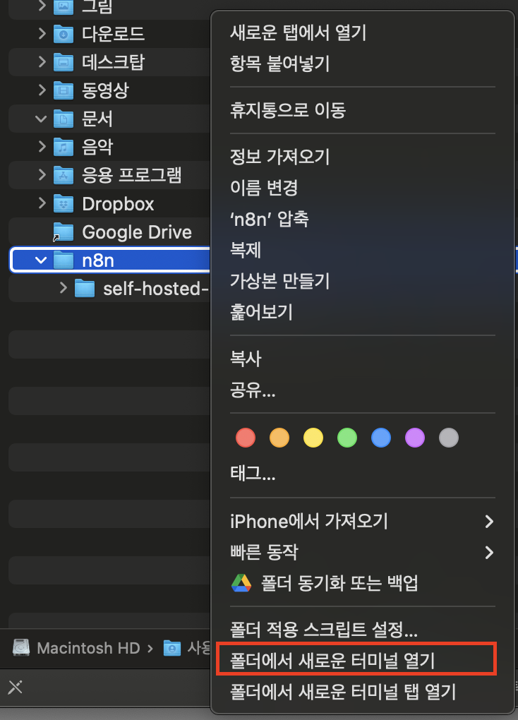 - 방금 만든 n8n 폴더를 마우스 오른쪽 버튼으로 클릭합니다.