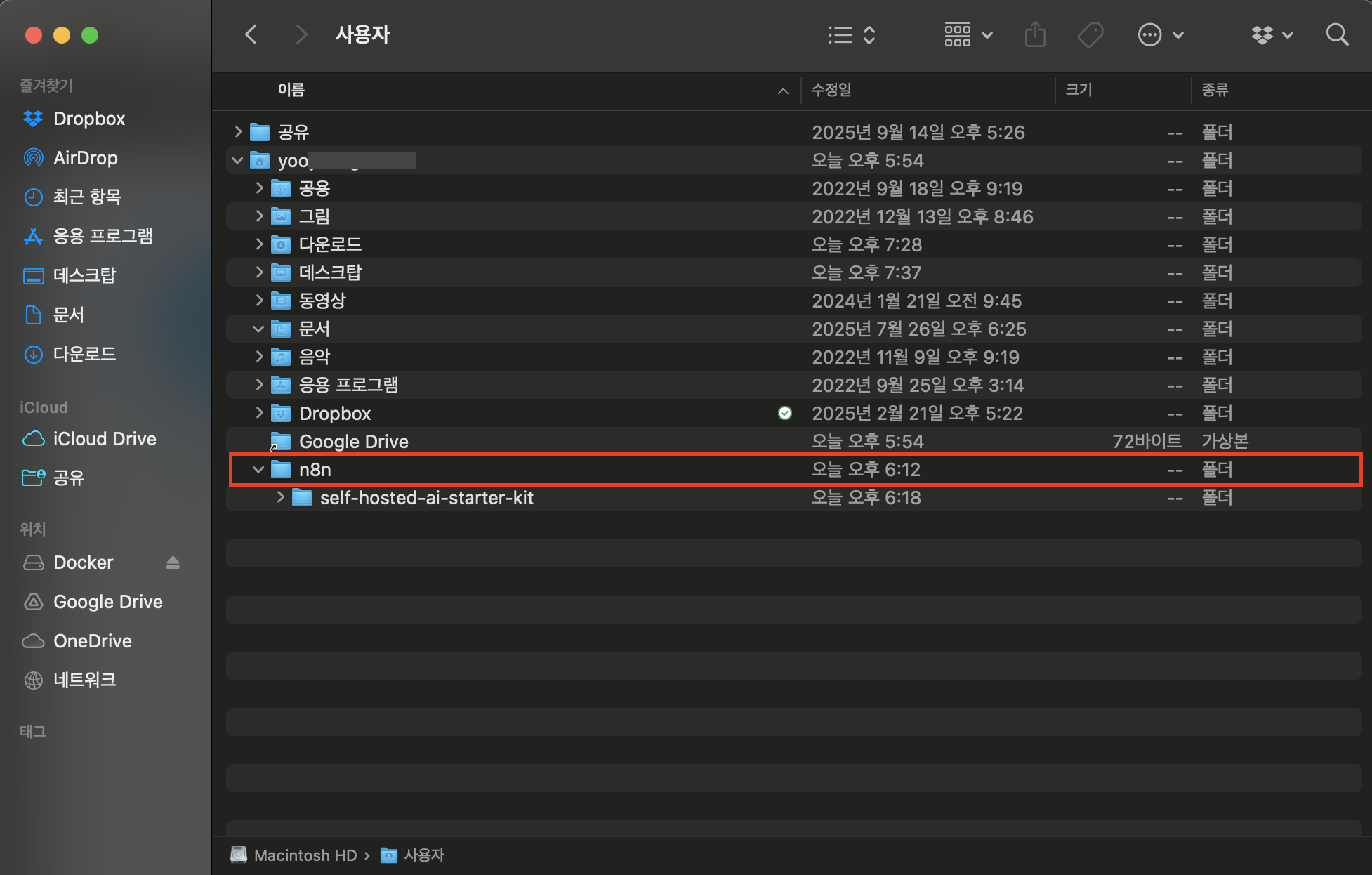 - 스타터 킷 설치가 완료되면 n8n 폴더 안에 self-hosted-ai-starter-kit라는 새로운 폴더가 생깁니다.