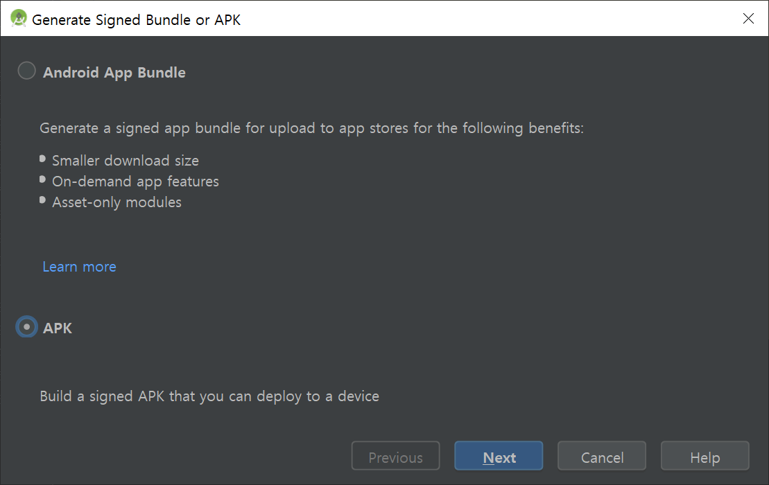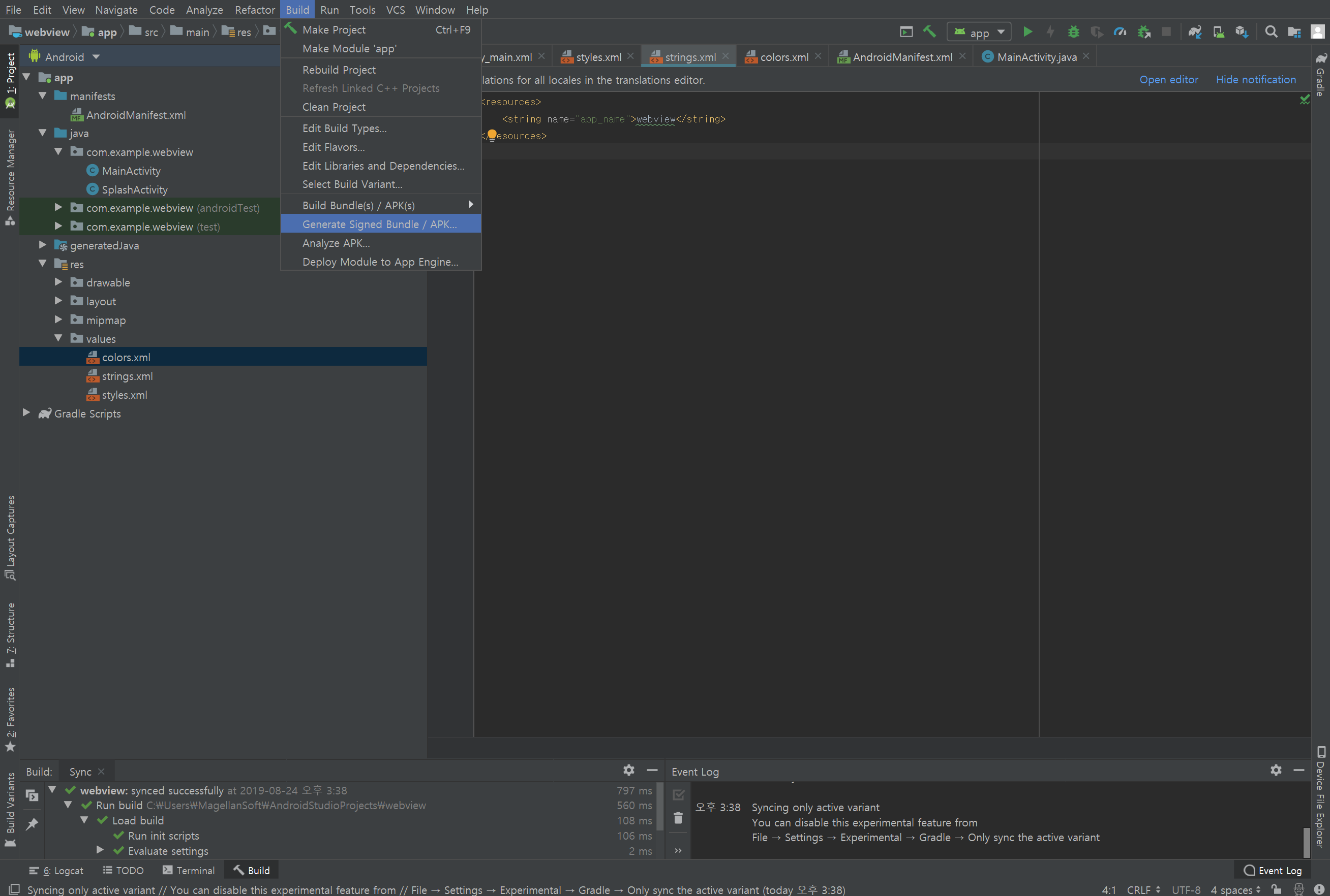 메뉴바에서 Build > Generate Signed Bundle / APK를 선택합니다.