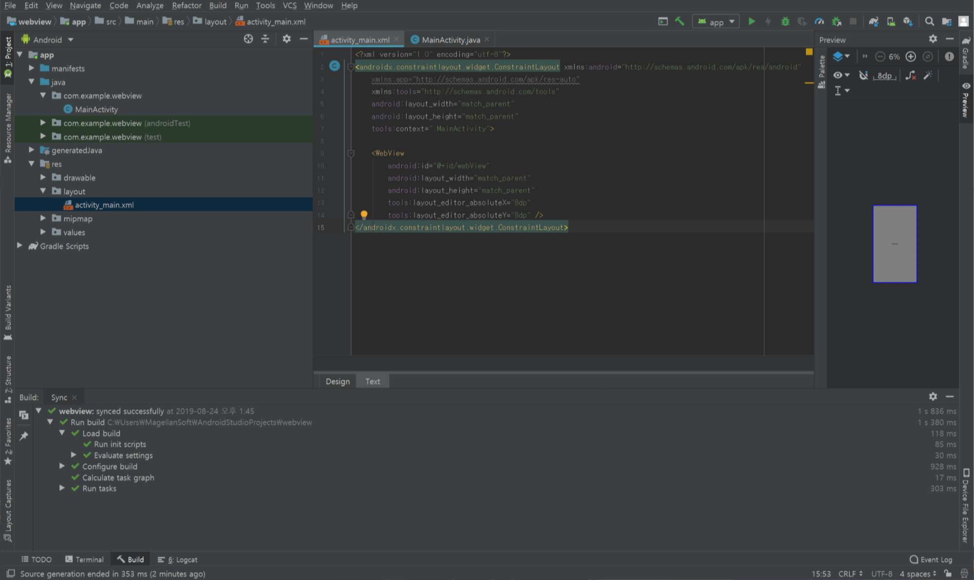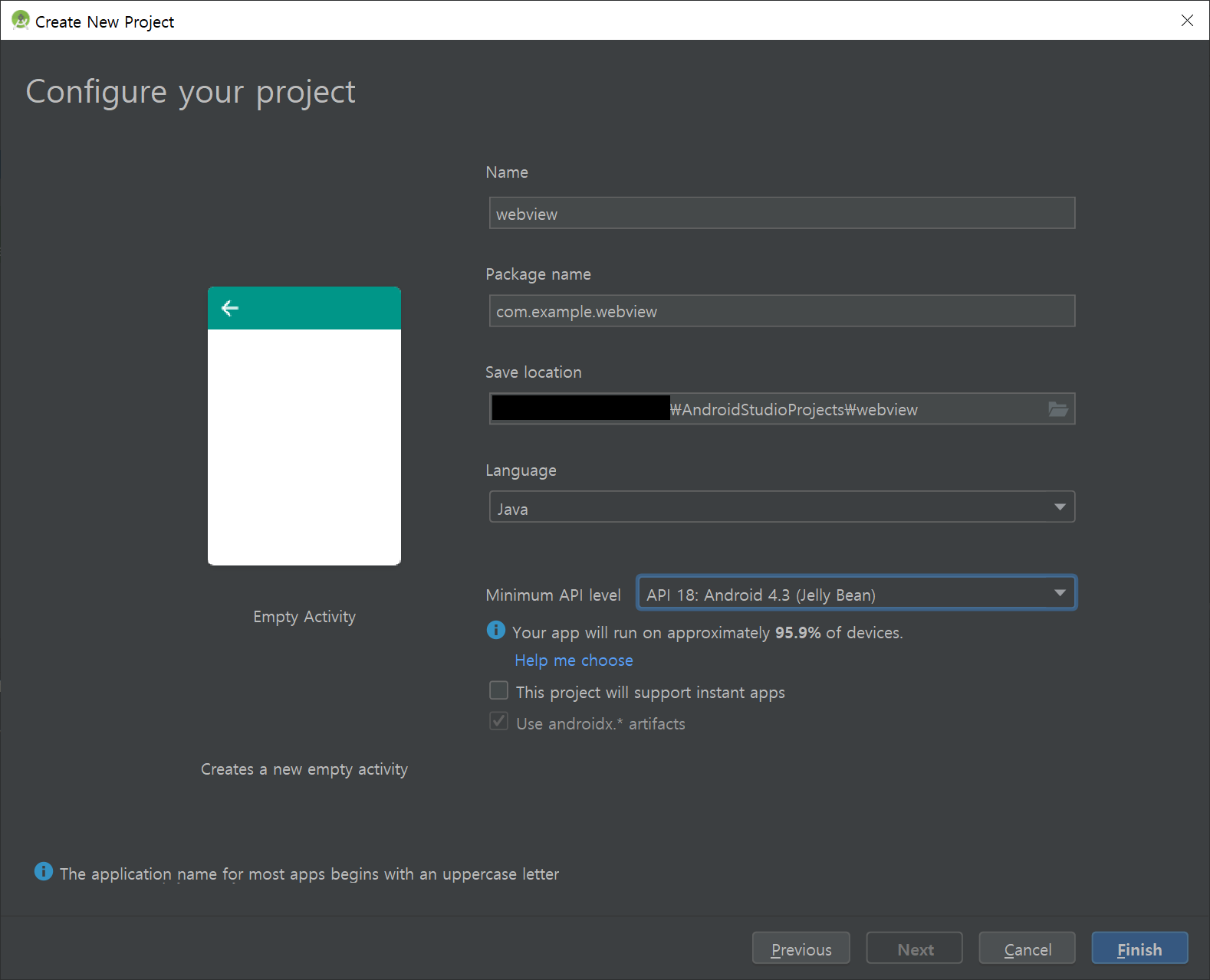 webview라고 작성된 Name은 프로젝트 명입니다. 어플리케이션의 이름은 뒤에 작성하게 됩니다.