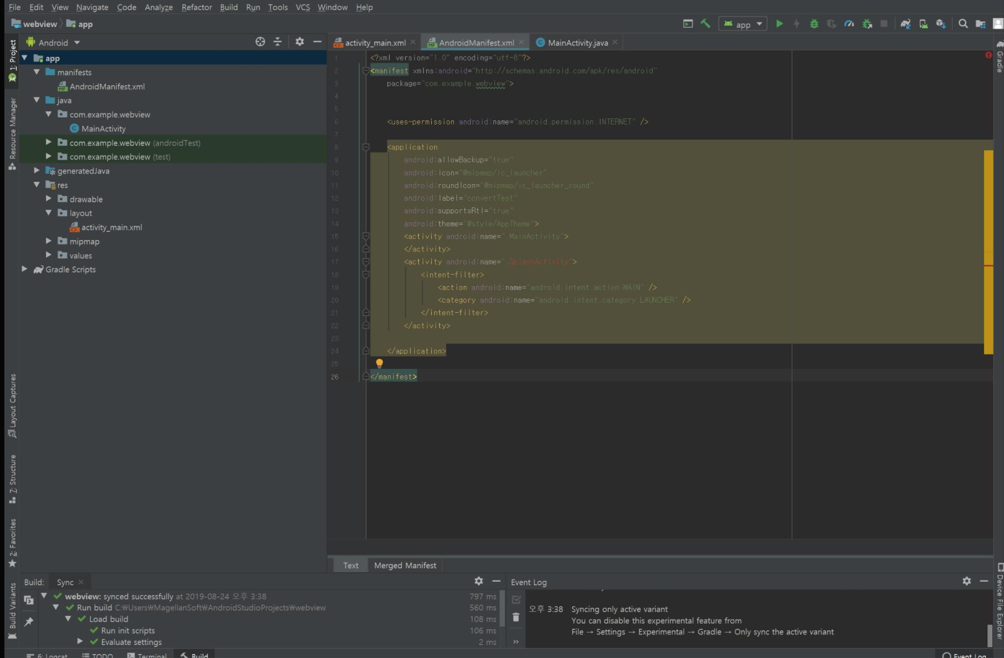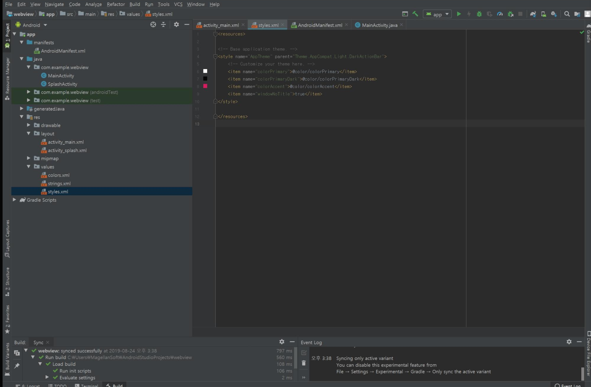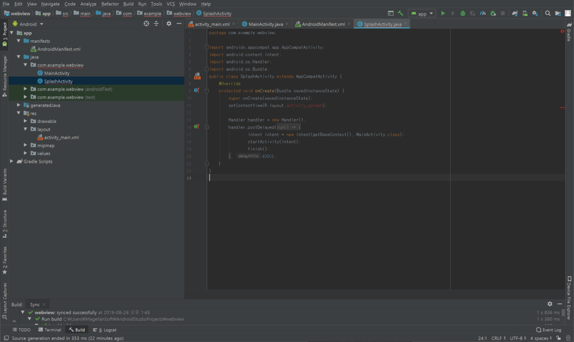위 내용을 복붙하면 아직 작성되지 않은 동작인 SplashActivity이름에 에러가 표시될 것입니다.