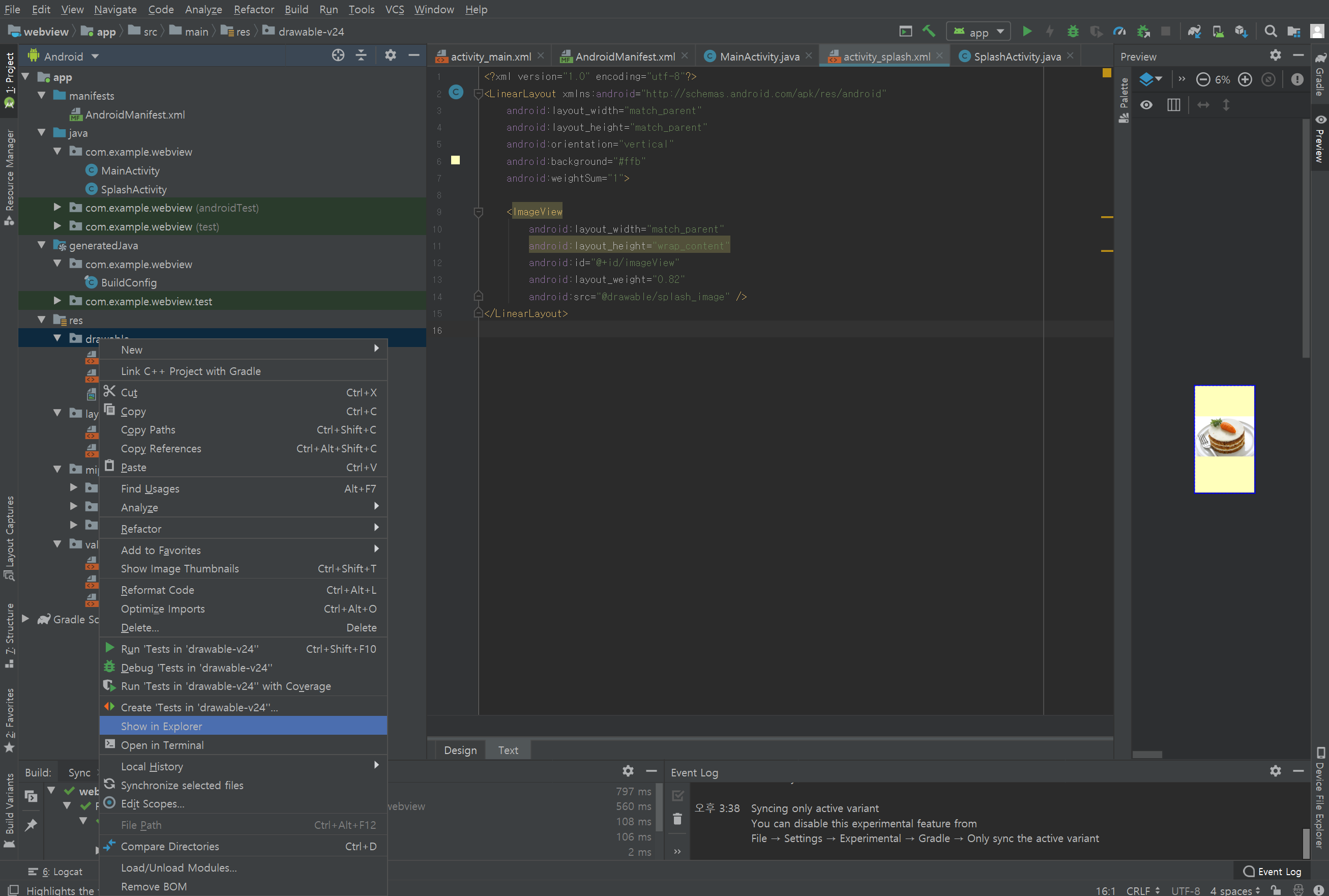 스크립트에서 작성한 이미지 경로인 @drawable/splash_image 에 실제로 이미지를 위치해 줍니다.