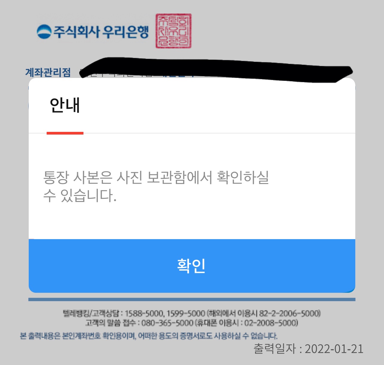 그러면 통장사본이 이미지로 저장되고, 아래와 같이 안내 메시지가 노출됩니다.