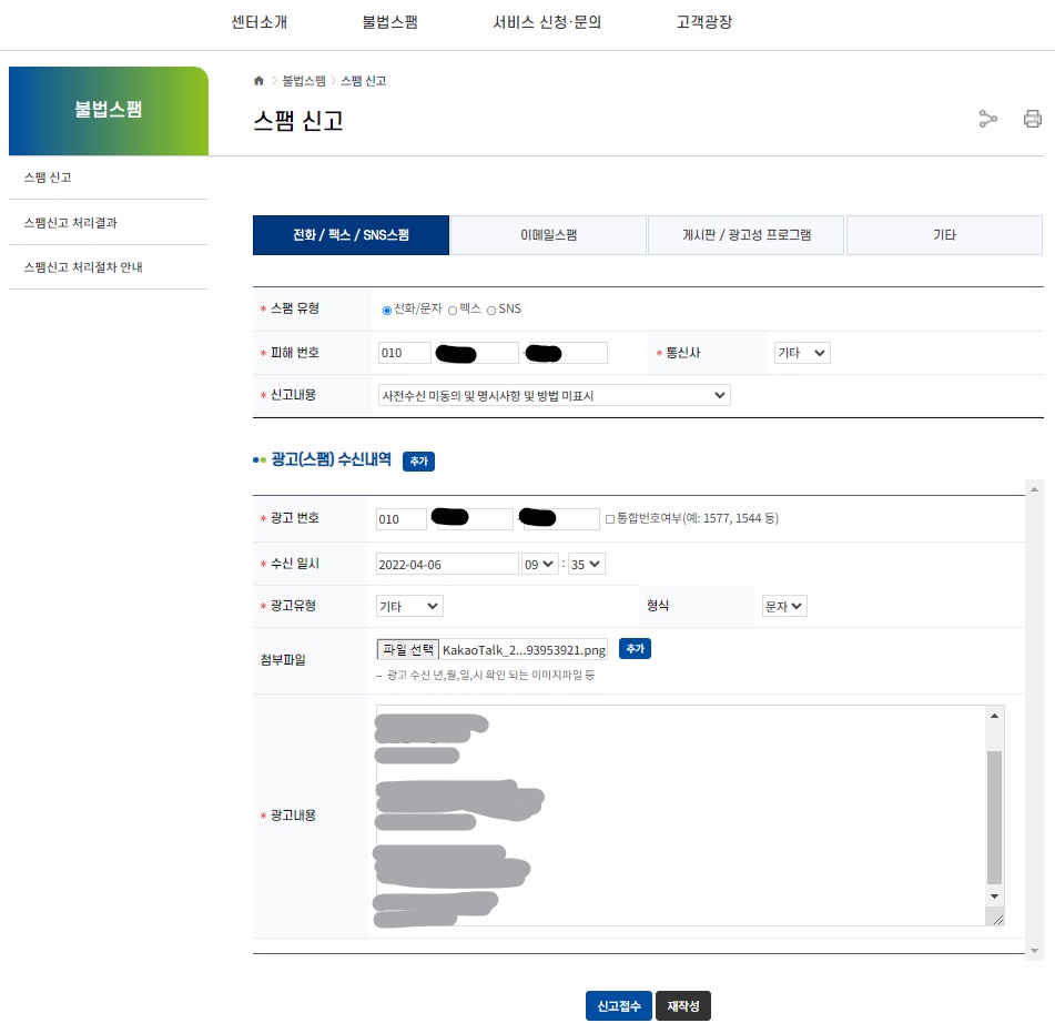 - 첨부파일: 해당 광고 메시지가 수신된 화면(가능한 한 발신 시간, 번호, 내용이 함께 보이도록)