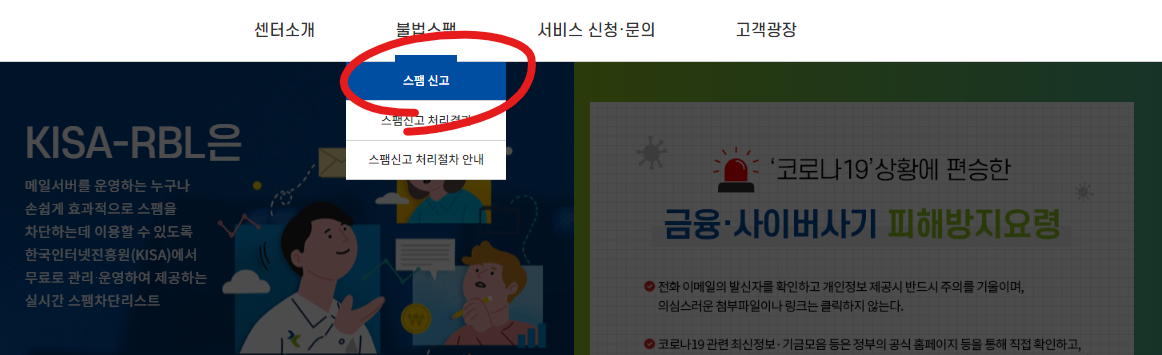 1. 불법스팸대응센터 홈페이지에서 "스팸 신고"메뉴 선택