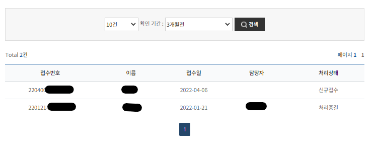 접수번호와 처리상태는 물론 담당자분까지 조회되는 모습입니다.