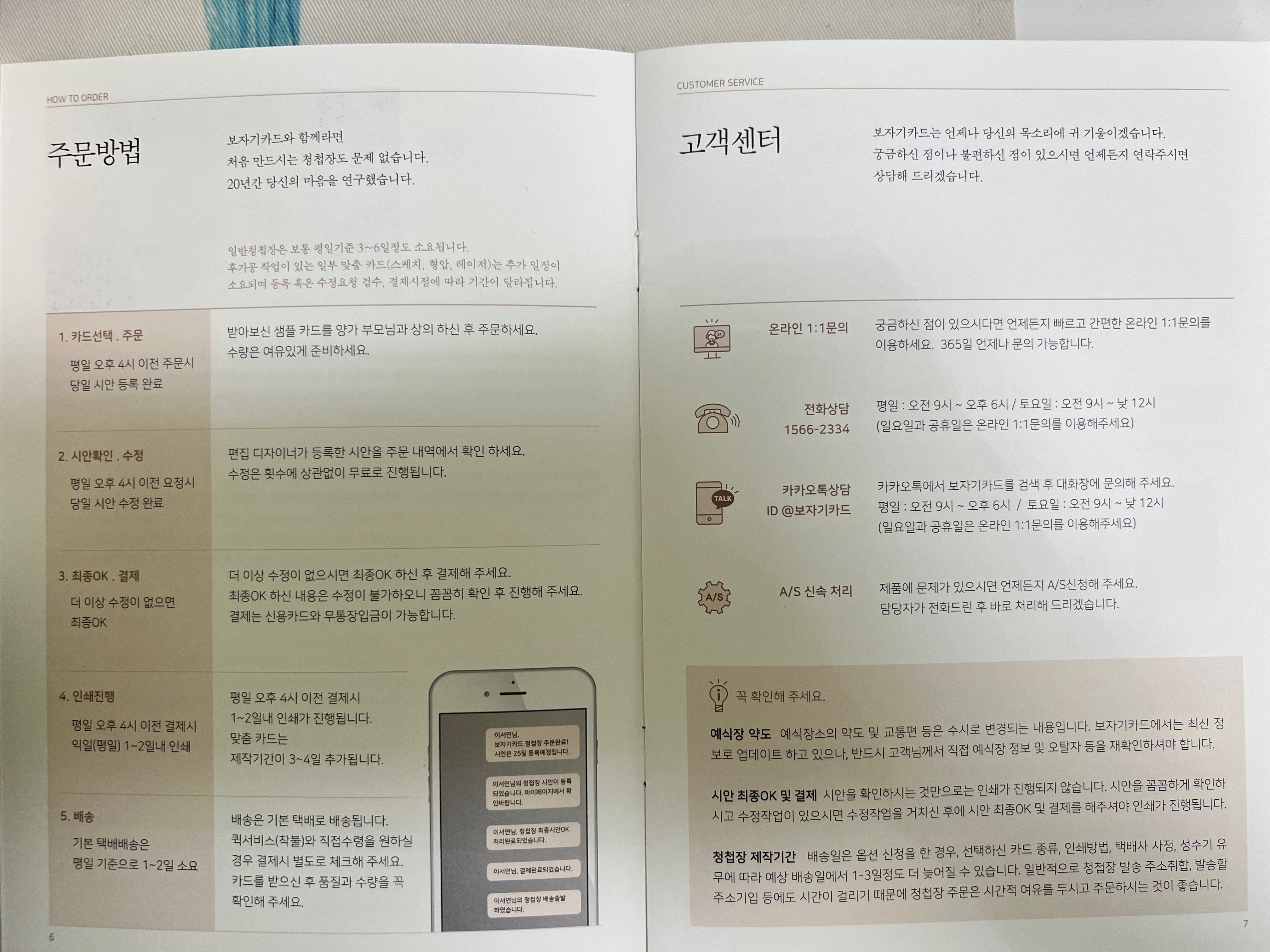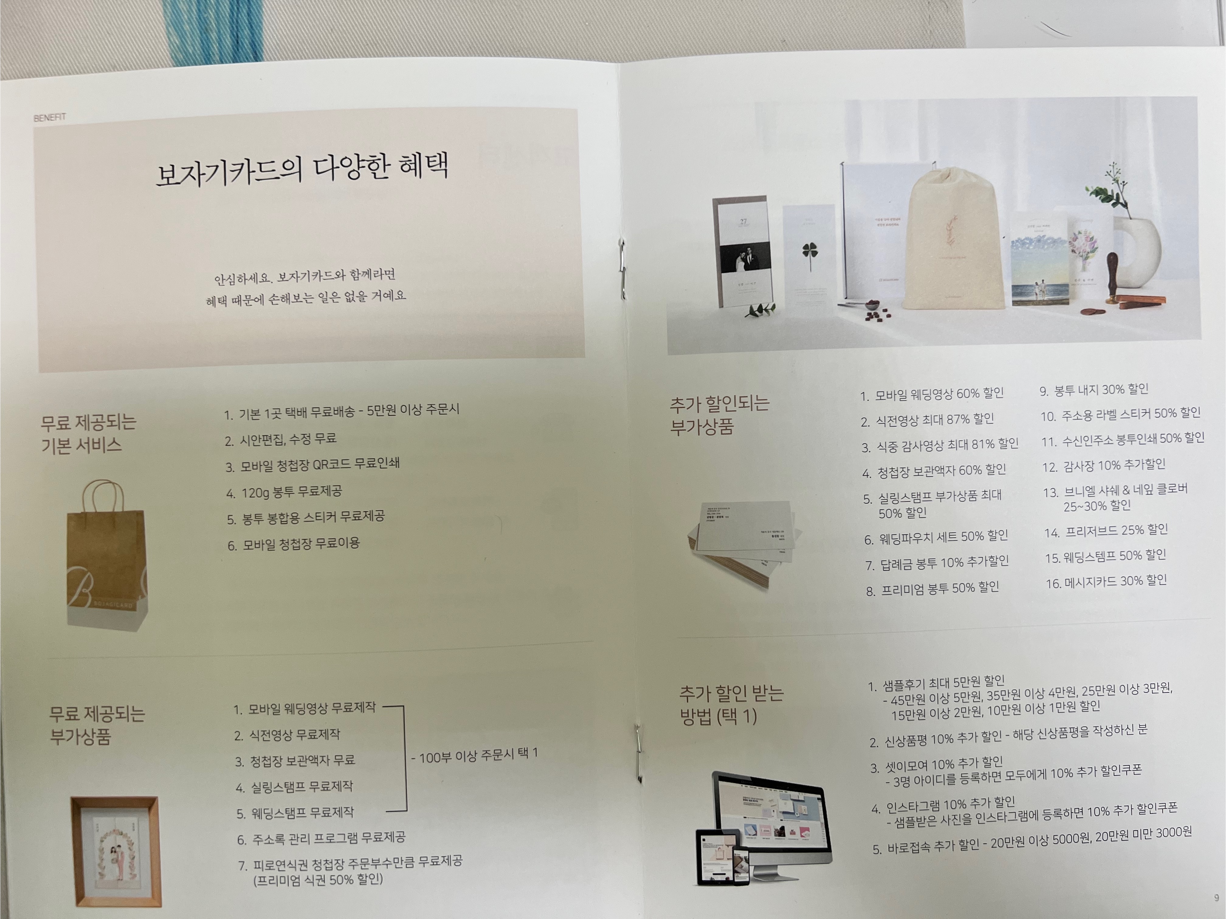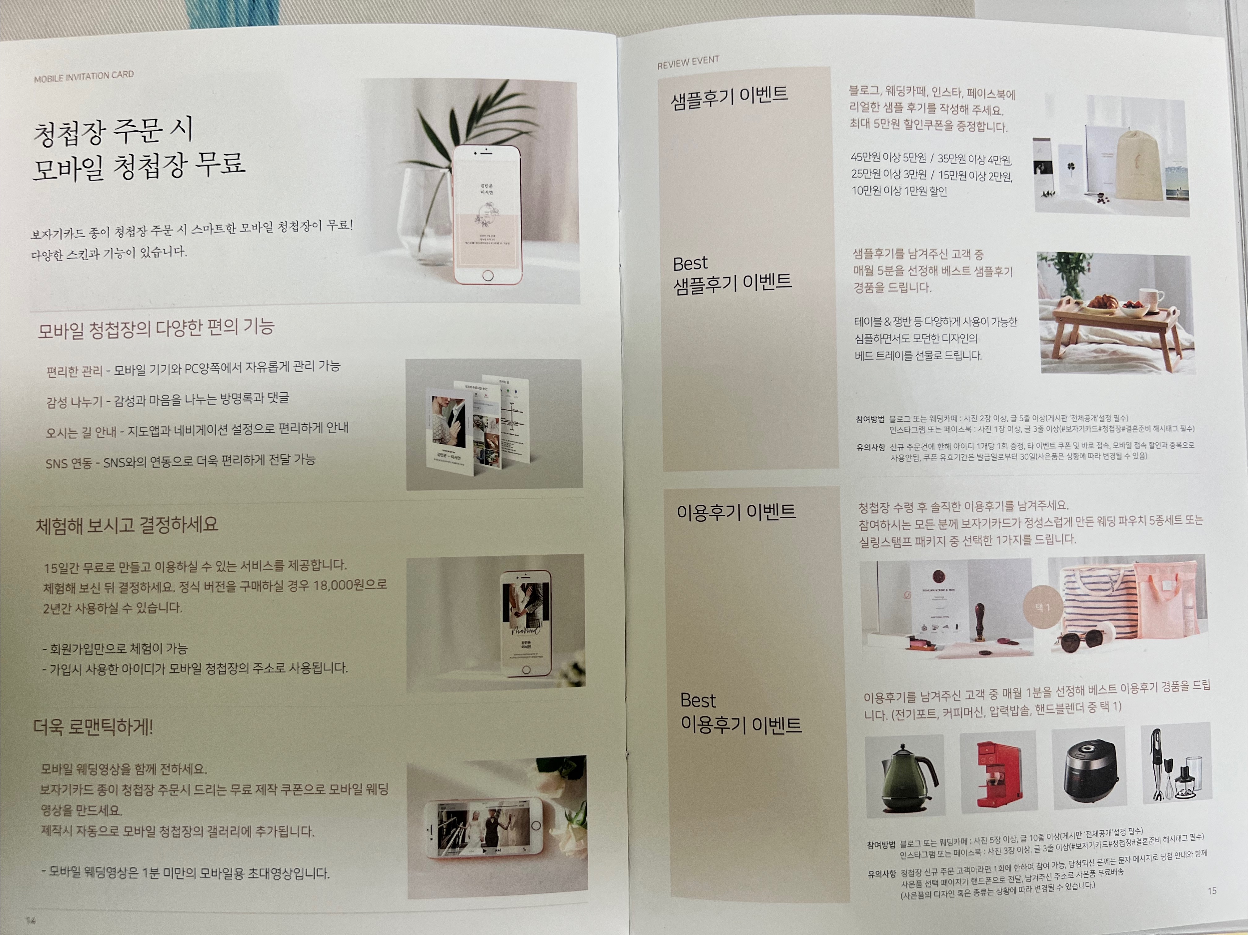 보자기카드 청첩장 샘플과 함께 받은 안내책자에는 신청 절차와 혜택, 후기 이벤트 등이 자세히 작성되어 있었습니다.