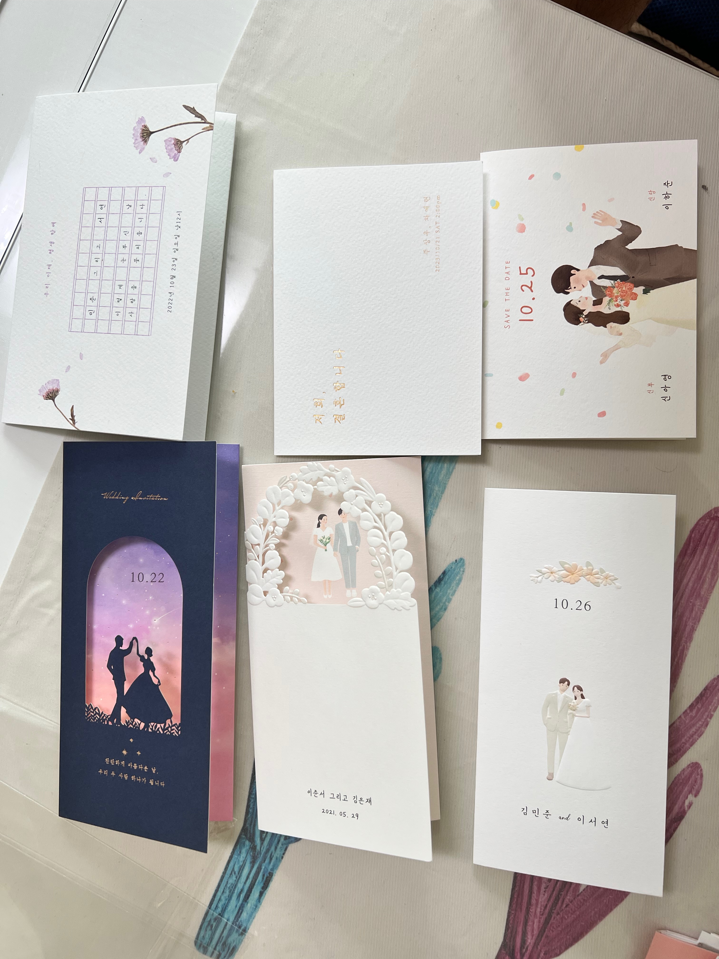 우선은 청첩장 그 자체의 퀄리티(디자인, 재질, 접고 펴는 방식)를 바탕으로 6장의 청첩장을 1차 선택했습니다.