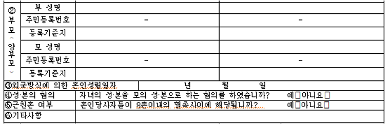 -> 혼인 당사자 중 한 명만 내방하는 경우에는 상대방 부모의 등록기준지를 확인할 수 없습니다.