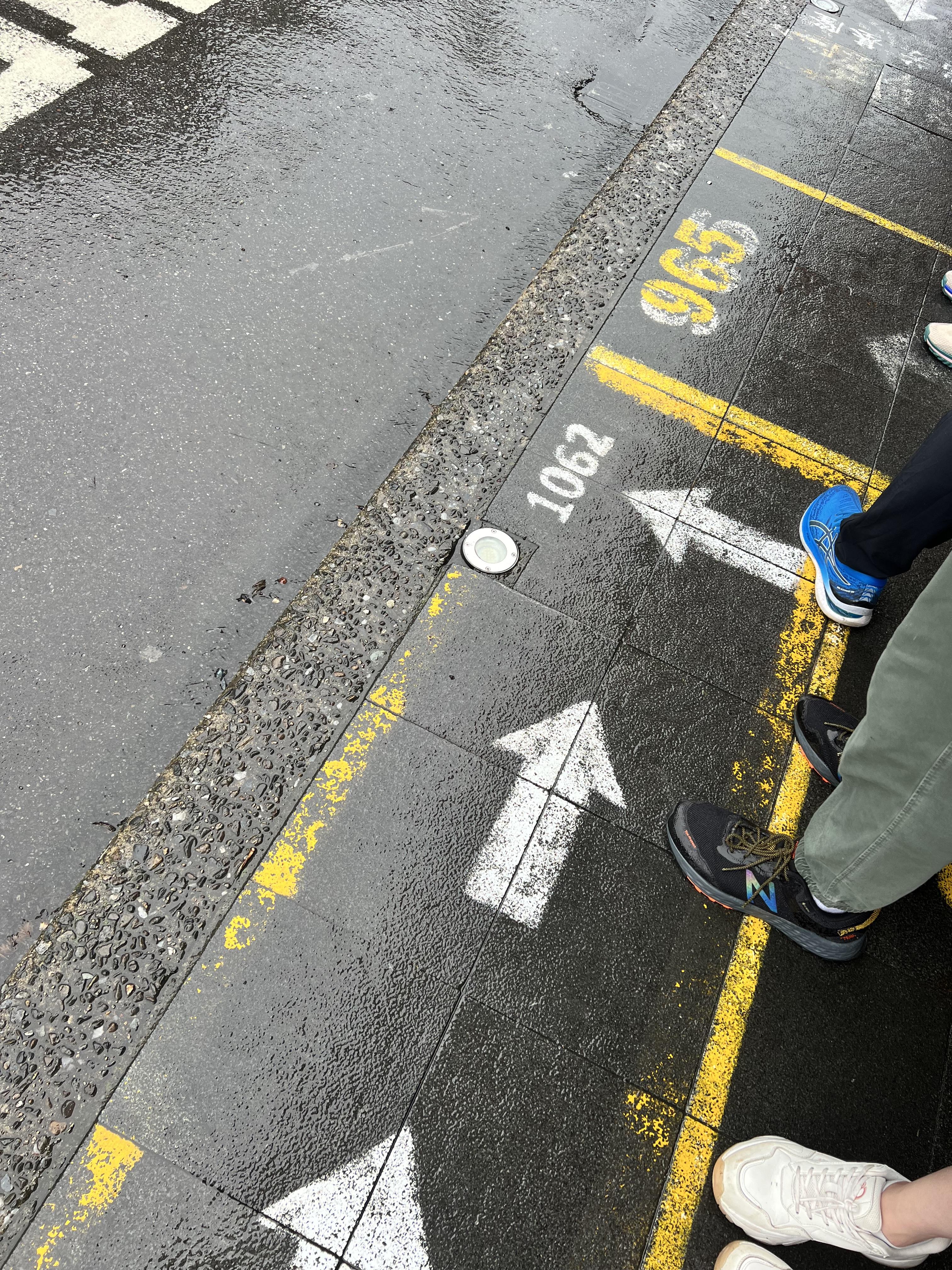 버스정류장 바닥에는 탑승 버스별 대기줄 안내선이 있습니다.