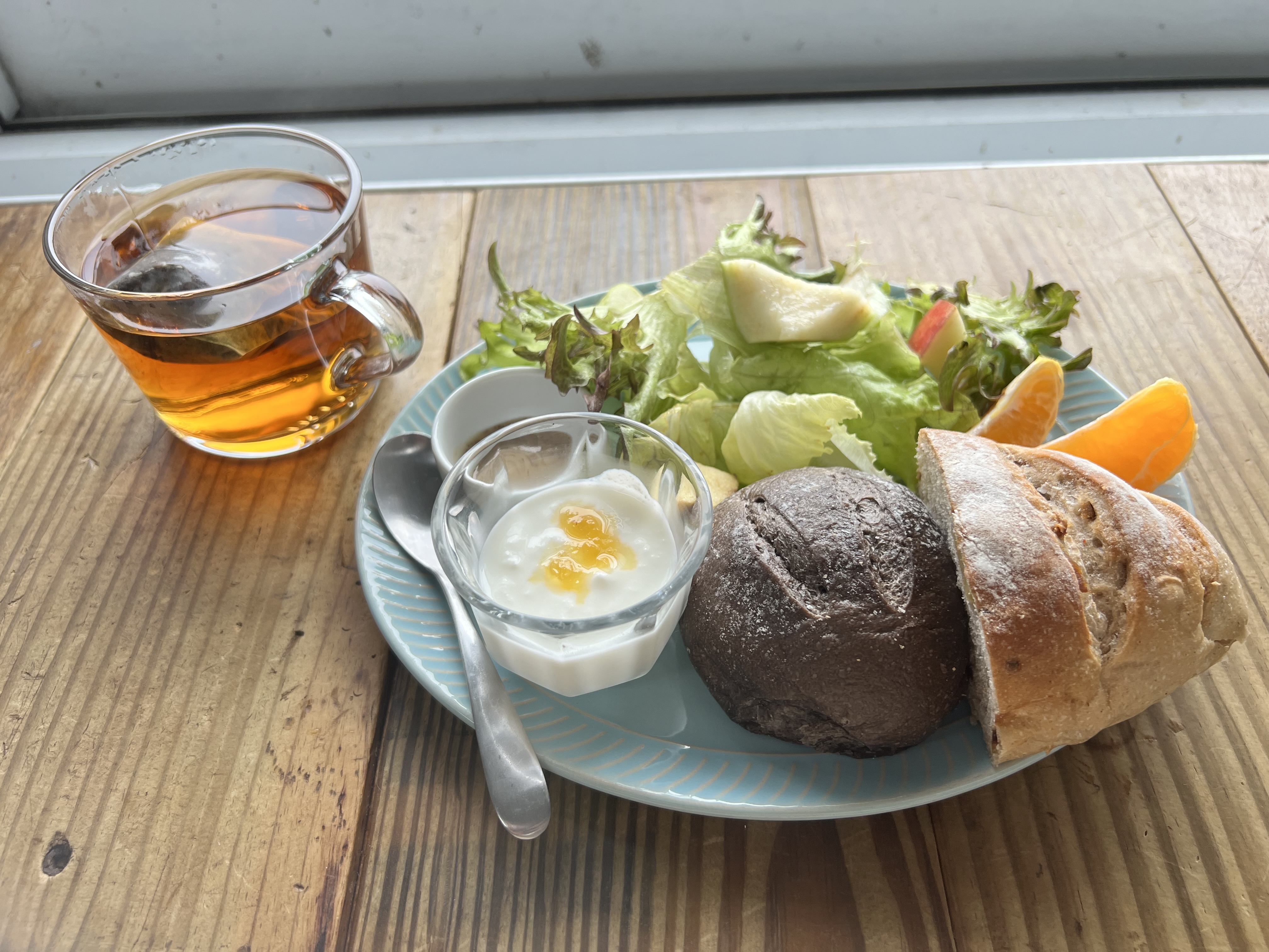 식사는 차/커피에 빵, 과일, 샐러드, 요거트로 단정한 구성이었습니다.